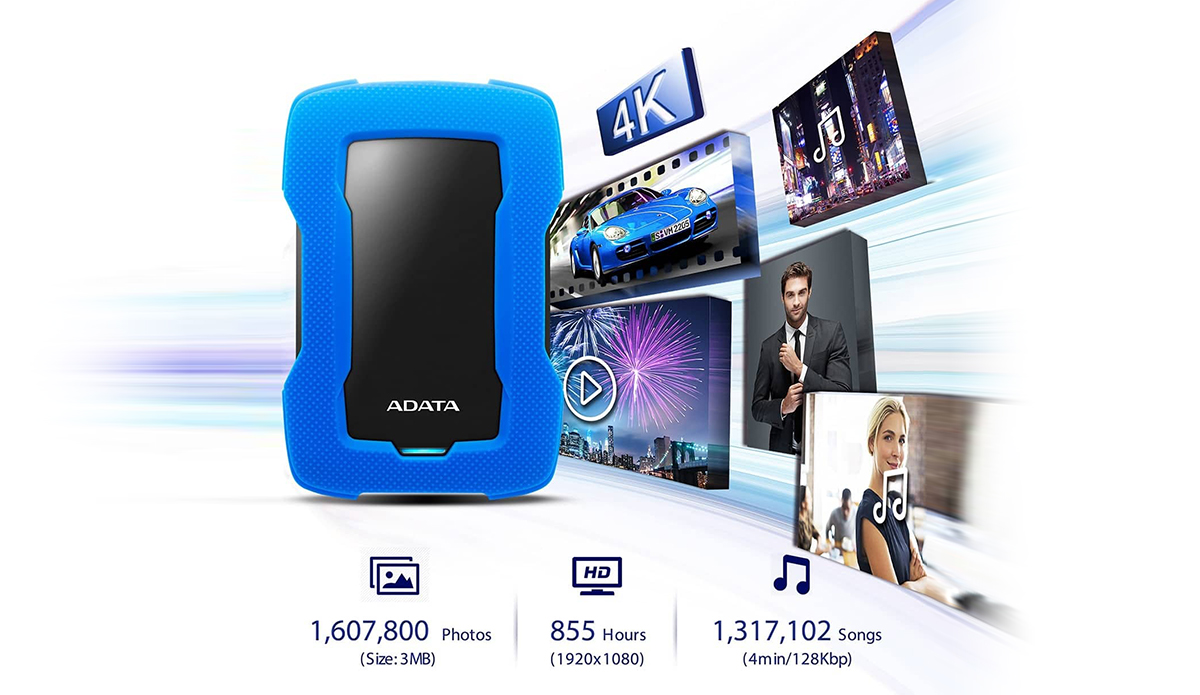 Bénéficiant d'une capacité pouvant atteindre 4 To, le disque dur externe ADATA HD330 protège vos données, de l’extérieur grâce à son boîtier en silicone et aux détecteurs de chocs exclusifs d'ADATA et de l’intérieur via le logiciel Backup ToGo. Cependant, malgré sa durabilité, le HD330 conserve un facteur de forme mince de 23,4 mm* agréable à regarder et facile à transporter.