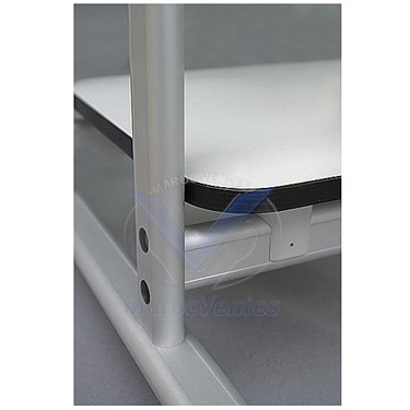Table professionnelle multi-projection avec deux étagères pour le projecteur, l'ordinateur portable ou l'imprimante. Le dessus est en panneau de meuble de couleur grise. La base en aluminium argenté est mobile grâce aux roues verrouillables.ST007