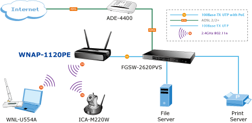 WLAN haute vitesse avec connexion Internet Le WNAP-1120PE est une solution idéale pour les utilisateurs résidentiels et de bureau pour profiter des avantages de la mise en réseau sans fil haute vitesse 300 Mbps. Localisez le WNAP-1120PE au point central d'un bureau ou d'une maison, puis connectez-le à un routeur ADSL. Un ordinateur portable ou un ordinateur de bureau à distance peut être facilement connecté à Internet en installant les adaptateurs WNL-9330 ou WNL-U554A Wireless Pre-N. En outre, le mécanisme WPA-PSK / WPA2-AES du WNAP-1120PE peut efficacement empêcher l'écoute des informations par des utilisateurs non autorisés. |