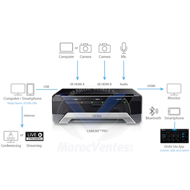CAMLIVE ™ Pro est conçu pour se connecter facilement à deux sources vidéo 4K et mélanger et diffuser au format FHD à un public mondial avec des effets vidéo exceptionnels et une qualité Full HD professionnelle. Il est entièrement plug and play et compatible avec n'importe quel logiciel de streaming et plate-forme de médias sociaux, tels que Skype, Teams, Zoom, OBS, YouTube et Facebook. Pour les streamers qui souhaitent faire des interviews, des présentations ou même des événements en direct, utiliser CAMLIVE™ PRO est simple et rapide !