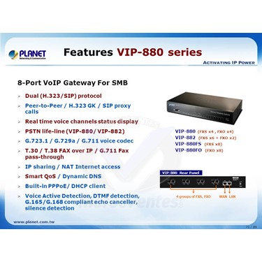 Avec des années d'expérience dans la téléphonie sur Internet et la fabrication de routeurs, PLANET est fière de présenter le tout dernier membre de la famille des passerelles VoIP PLANET: le VIP-880 / VIP-880FO / VIP-880FS / VIP-882.